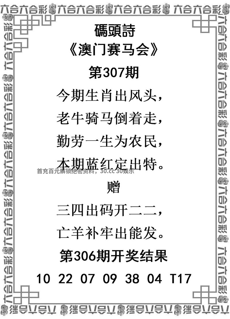 308期解析:回头是岸金不换,牛头马面双双合,忠厚老实最吃苦,双数合单定格局。 综合生肖:牛马猴蛇猪兔 必中四肖:牛马猴蛇 暴富一肖:牛  |